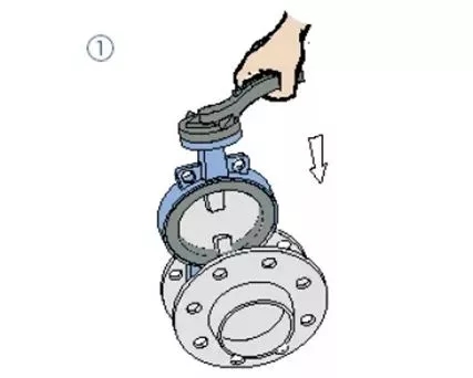 1、如所示,將閥門放置于預(yù)安裝的兩片法蘭之間,注意螺栓孔要整齊對齊。
